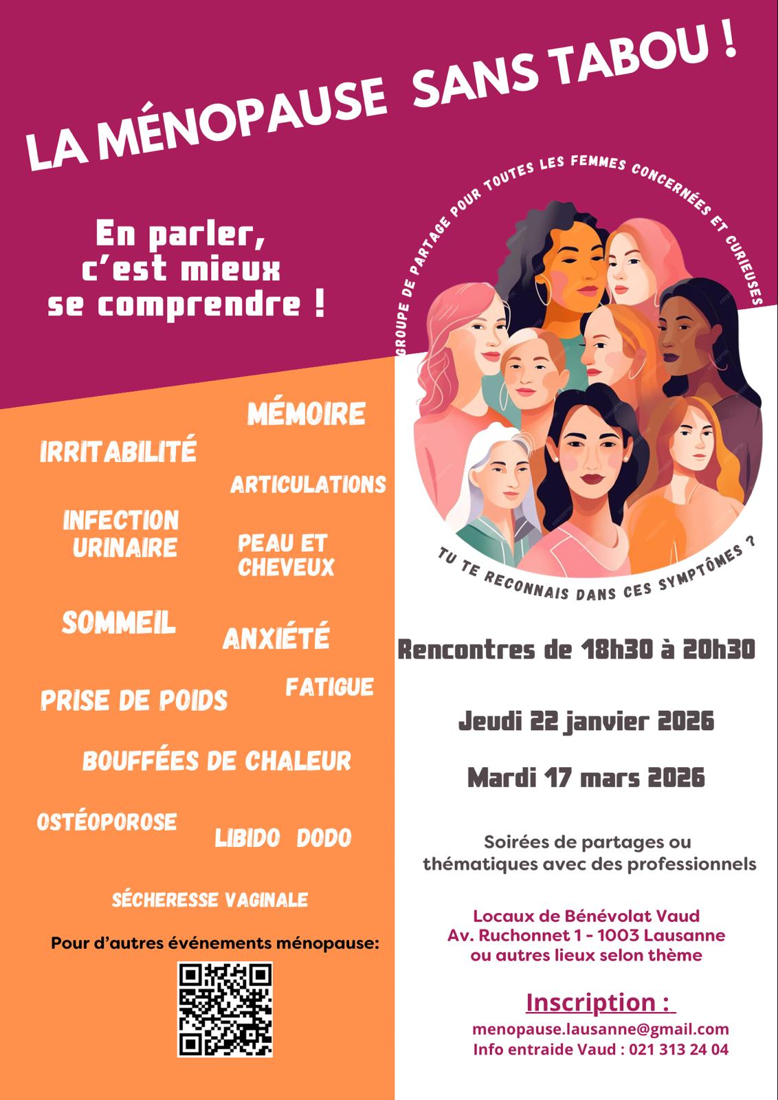 Contacte directement le groupe pour te renseigner ou t'inscrire: menopause.lausanne@gmail.com