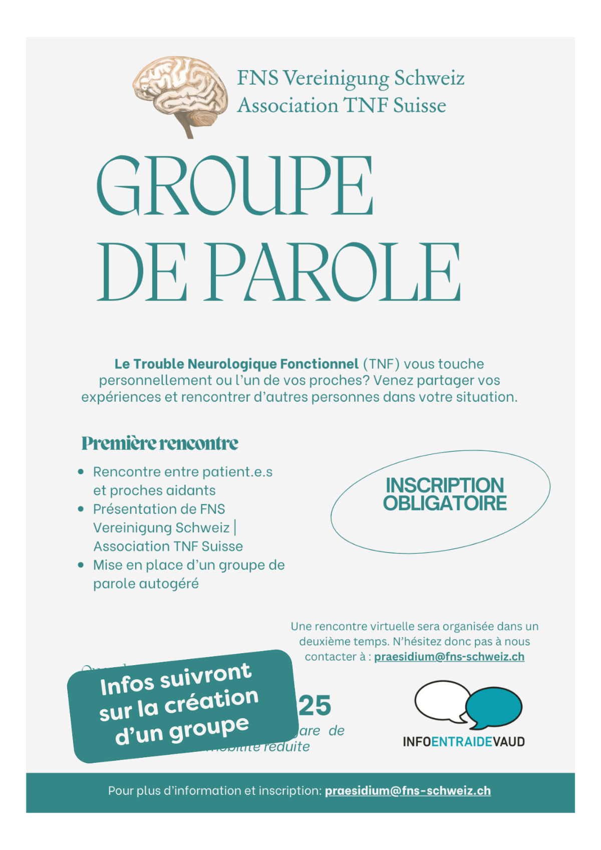 📆 Pour participer à ce premier groupe romand, vous pouvez vous informer auprès de l'association, par courriel à : praesidium@fns-schweiz.ch